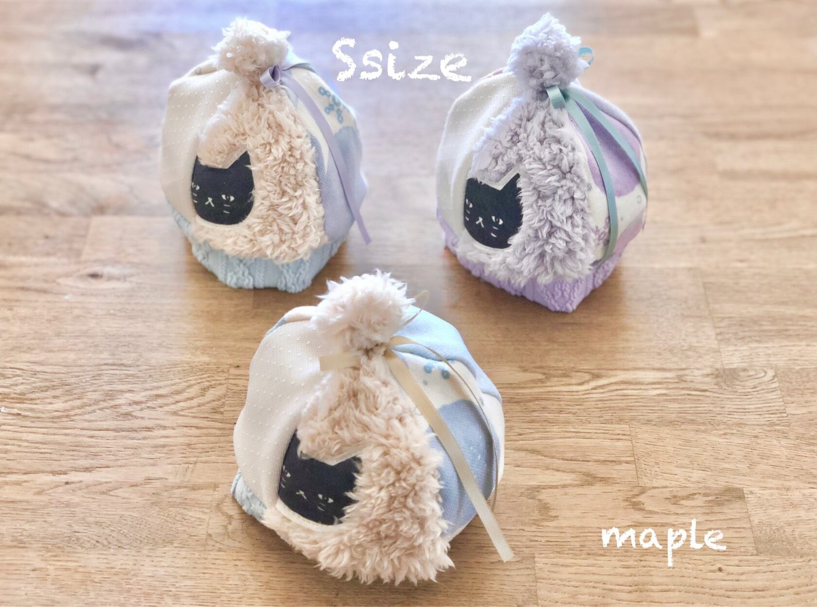 ファーの面にニャンコを縫い付け、てっぺんのポンポンにはリボンを結びつけてアクセントにしました。(リボンは解けません)